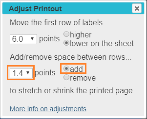 This second type of misalignment can be adjusted with the second group of settings on the "Adjust printout" pop-up dialog. In this example with too little space between each row of labels you will need to add more space.
