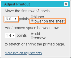 The way to determine if this initial guesstimate of "6.0 points lower" is an appropriate adjustment is to print out the labels and check to see if they were lowered enough, not enough, or possibly too much. You will likely need to fine-tune the amount (more or less than 6.0) until the positioning is correct, but in this example, you wouldn't want to change this setting to "higher on the sheet".